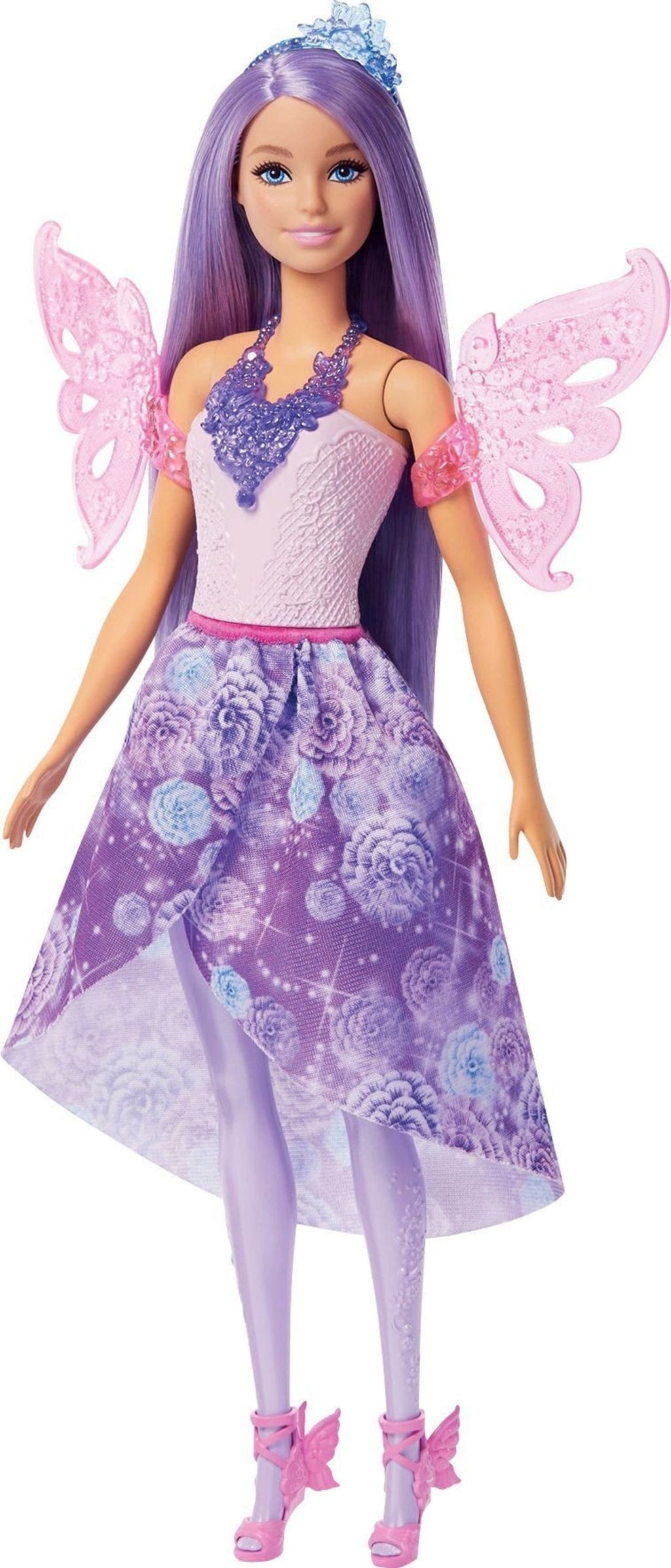 - Barbie with 8-piece fashion set consisting of 1 pair of wings, 1 mermaid tail fin, 1 skirt and accessories