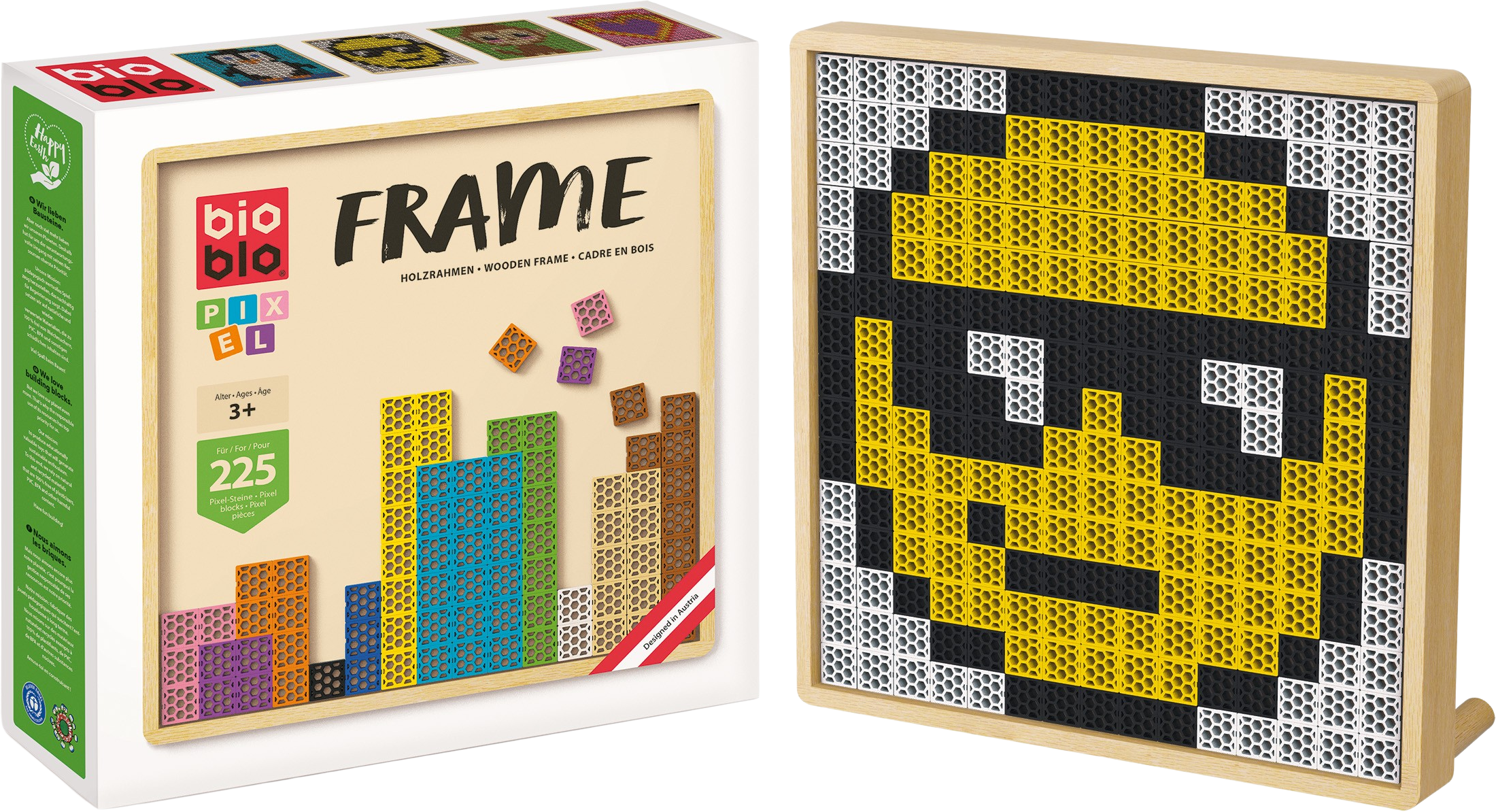With this lovingly designed pixel frame, you can conjure up a cheerful smiley-themed work of art in no time at all. The 225 colourful building blocks can be easily inserted into the sturdy wooden frame and offer you a creative introduction to the world of Bioblo PIXEL. Whether as a playful building project or as a decorative highlight in the children's room, your finished work of art is guaranteed to put everyone in a good mood. Thanks to the practical feet, you can set up the frame flexibly or hang it on the wall. A great set for little builders with big imaginations.