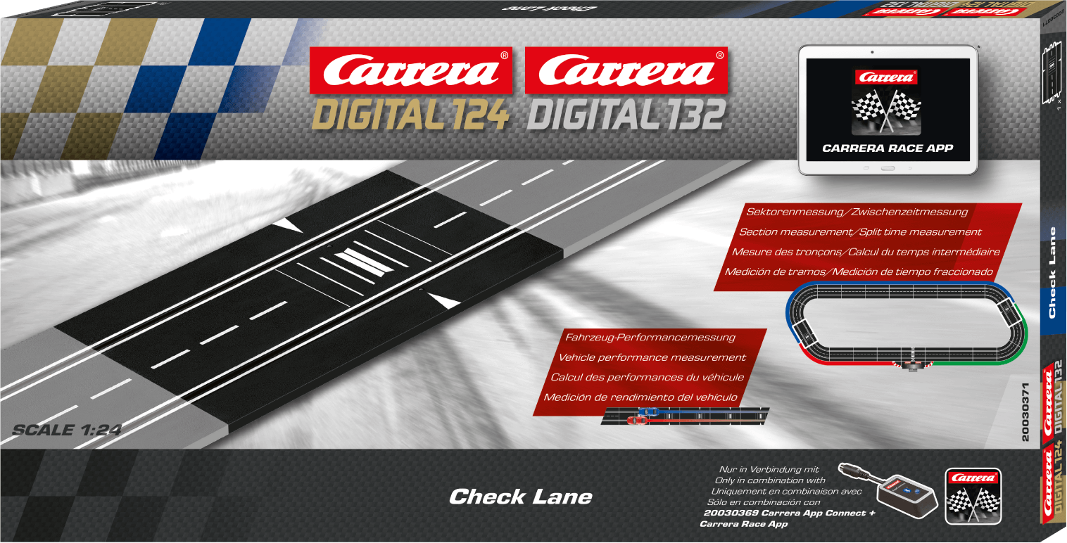 With the Check Lane, you can divide the Carrera track into sections, measure split times and improve the performance of your racing cars. One Check Lane divides the track into two sections, two Check Lanes into three sections, etc. To be able to measure the time, you also need the Carrera App Connect (20030369) and the Carrera Race App.