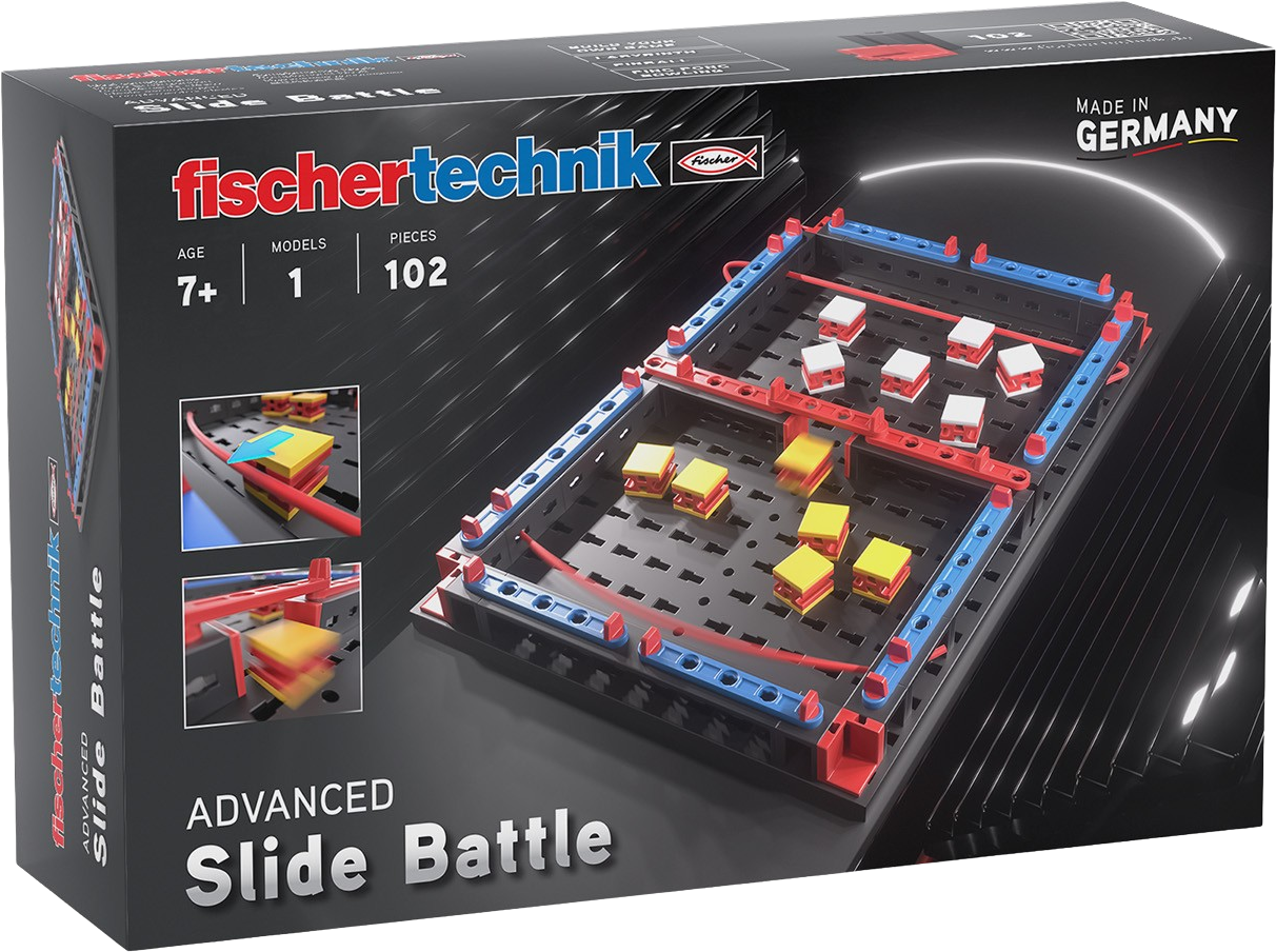 With the fischertechnik ADVANCED Slide Battle, you can create your own mini playing field, and then the competition can begin! Who can clear their field faster and skilfully hurl the stones into the opponent's half? Speed, skill and lots of fun are what count. A great set for little inventors and game lovers who love to build and even more so to compete against each other in a duel.