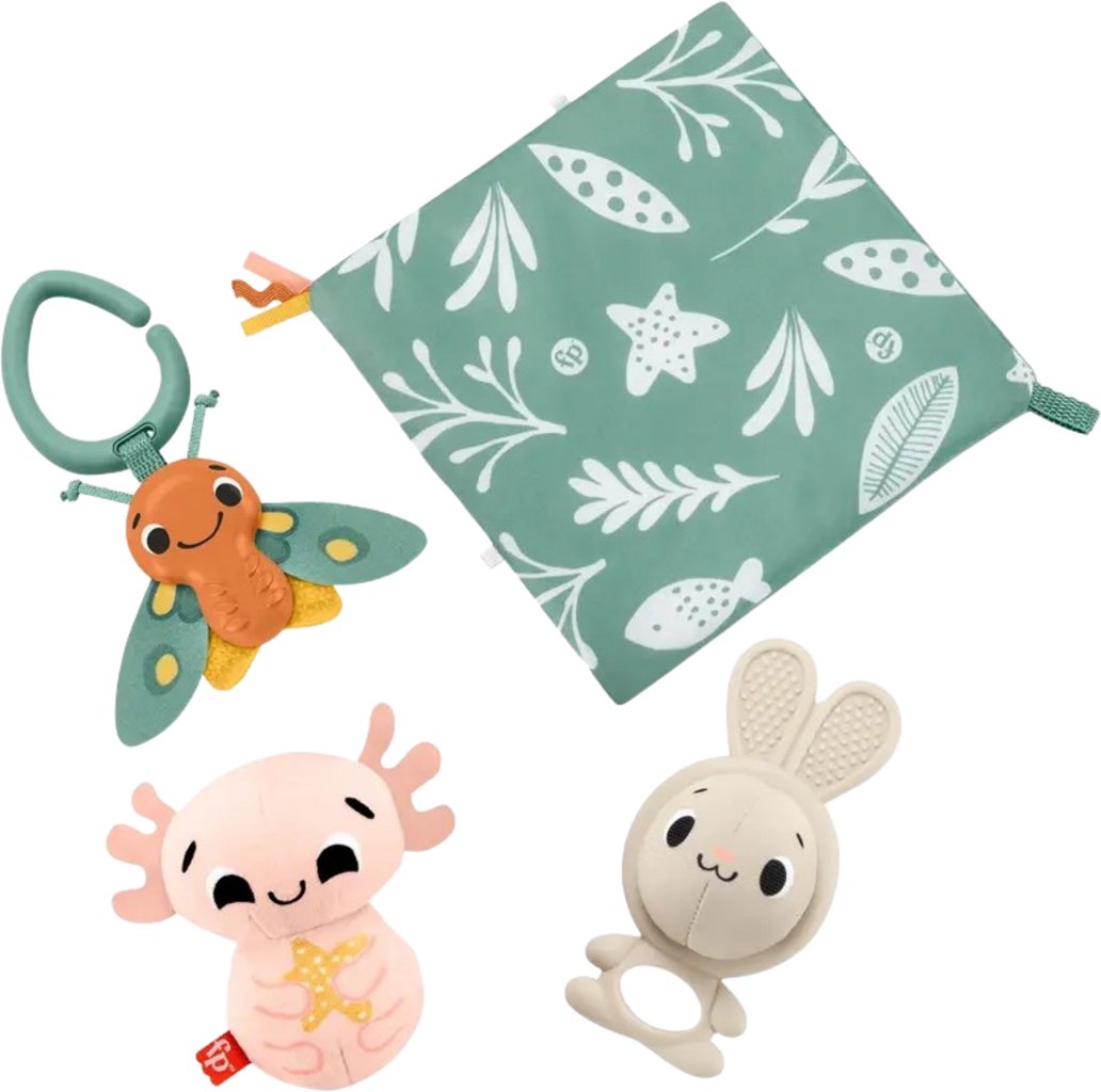 Contents: Bunny-shaped teething ring, plush axolotl, moth rattle and crinkly cloth