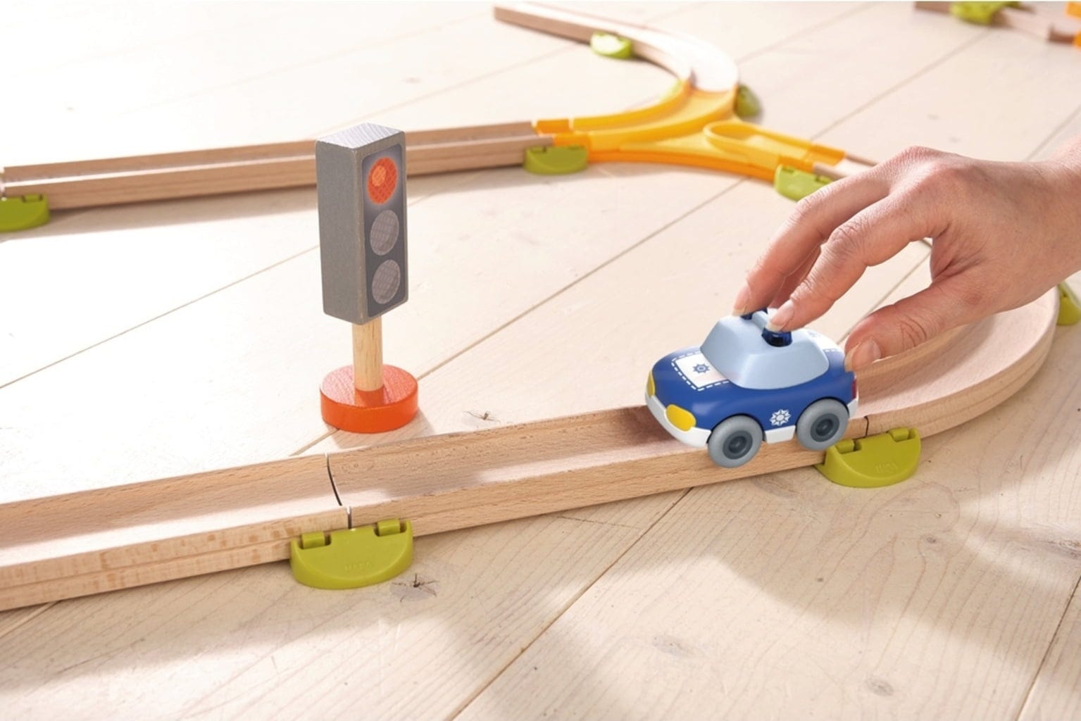 This reliable police car maintains law and order in the vibrant Kullerbü world. It is simple to operate with the swing motor, requiring just a single push to zoom around the track.