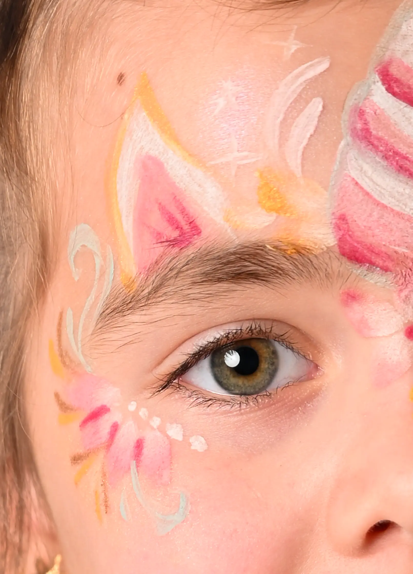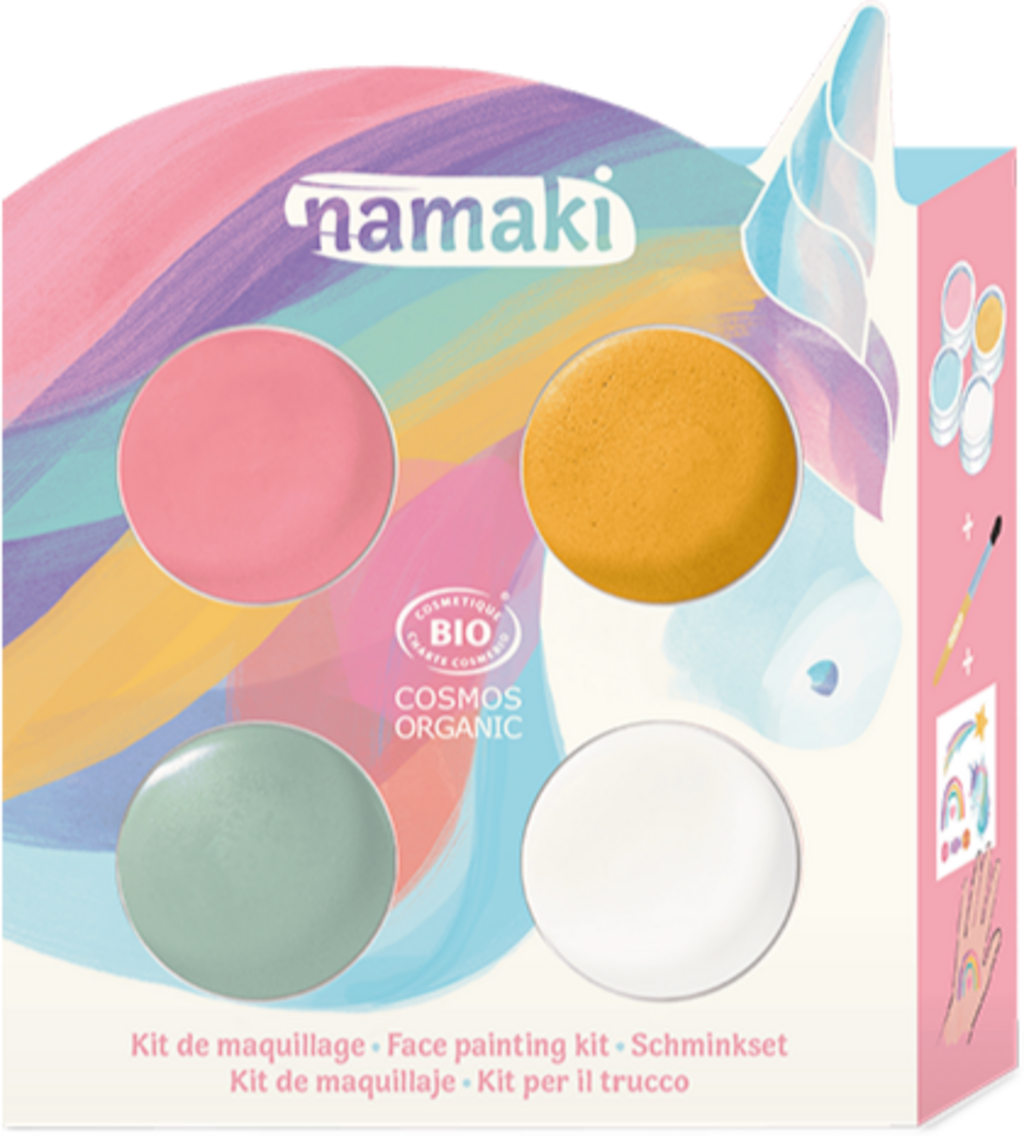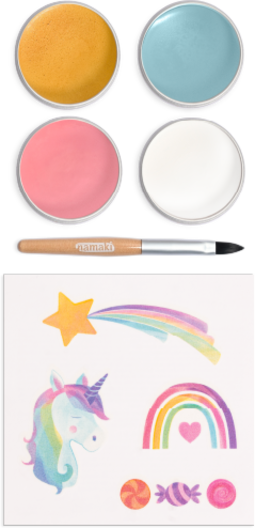 The unicorn make-up set contains jars in the colours pink, light blue, golden yellow and white, to easily create a unicorn, a pastel rainbow, a princess or even pretty arabesques in no time at all. The sheet of adhesive tattoos, also included in the set, rounds off the make-up!