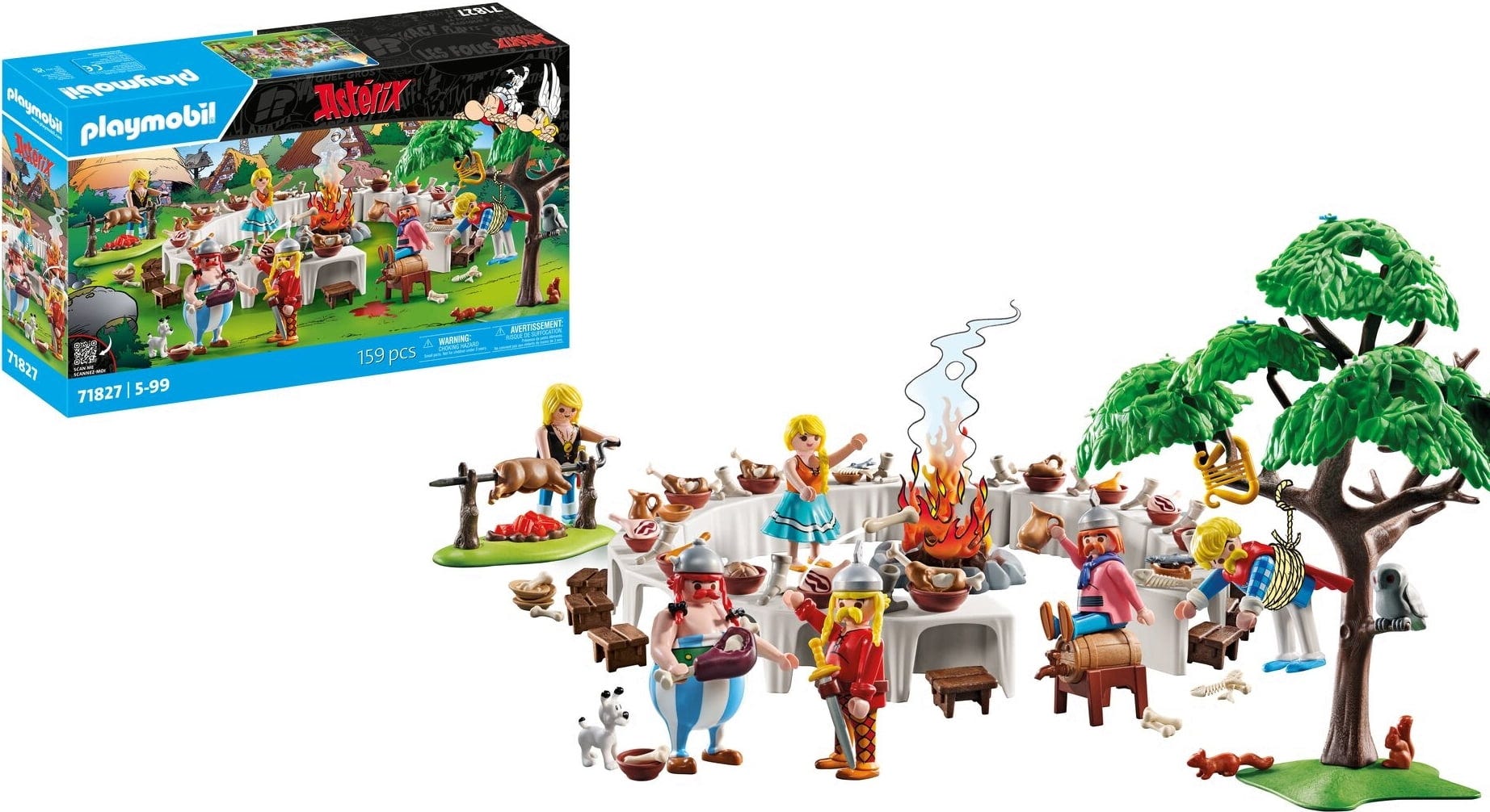 Contents: Obelix, Troubadix, 2 Gauls and 2 Gaulish women, Idefix, 2 squirrels, 1 owl, 6 tables, 1 fire pit, 1 fire pit with spit, 18 stools, 18 drinking cups, 18 plates, 18 stools, 3 logs, 4 fish bones, 4 fish, 4 hams, 1 loaf of bread, 1 beer parlour, 3 roast wild boar, 5 pieces of meat with bones, 1 tree
