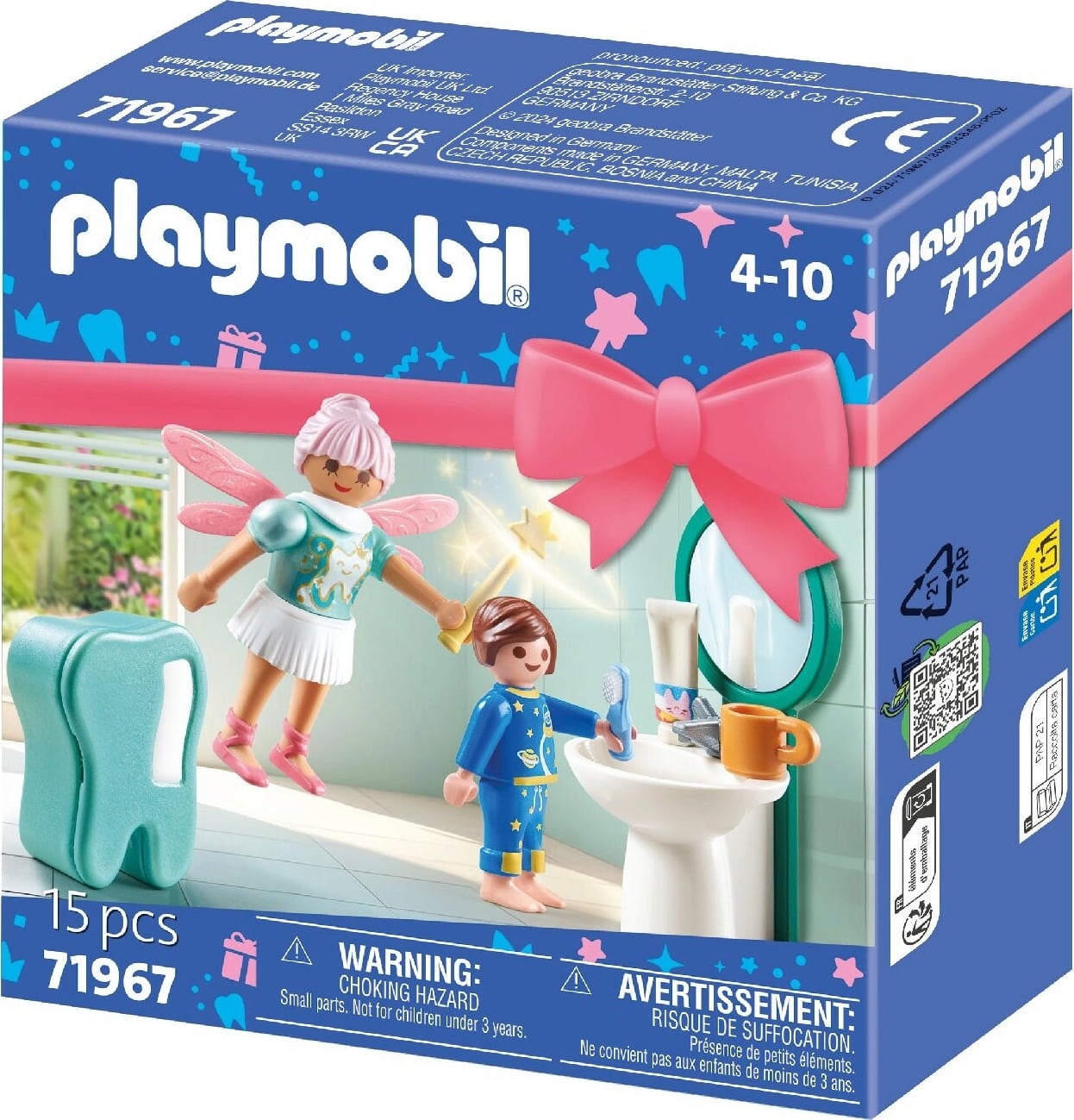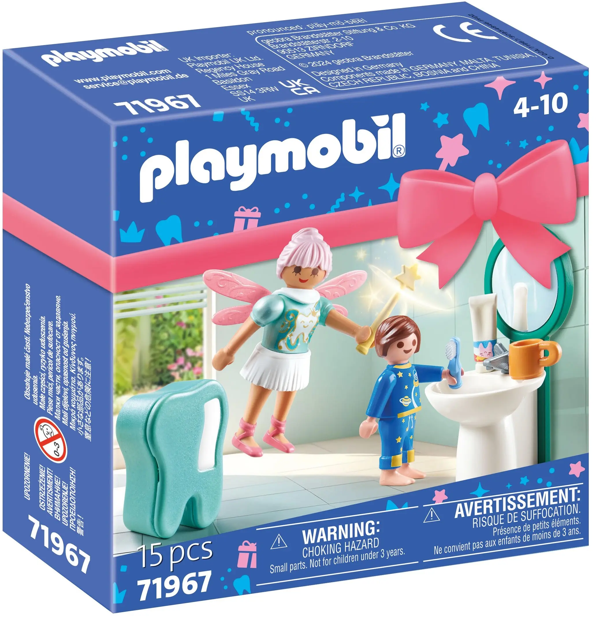 Contents: 1 fairy, 1 boy, 1 casket, 1 washbasin with mirror, 1 toothbrush, 1 toothpaste, 1 mug, 1 magic wand