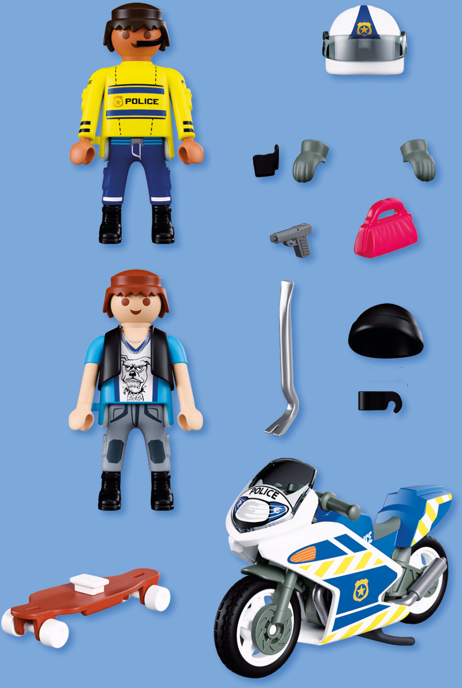 Figures: 1 police officer, 1 thief, 1 motorcycle helmet, 2 gloves, 1 holster, 1 pistol, 1 motorcycle, 1 cap, 1 skateboard, 1 handbag, 1 holder, 1 crowbar