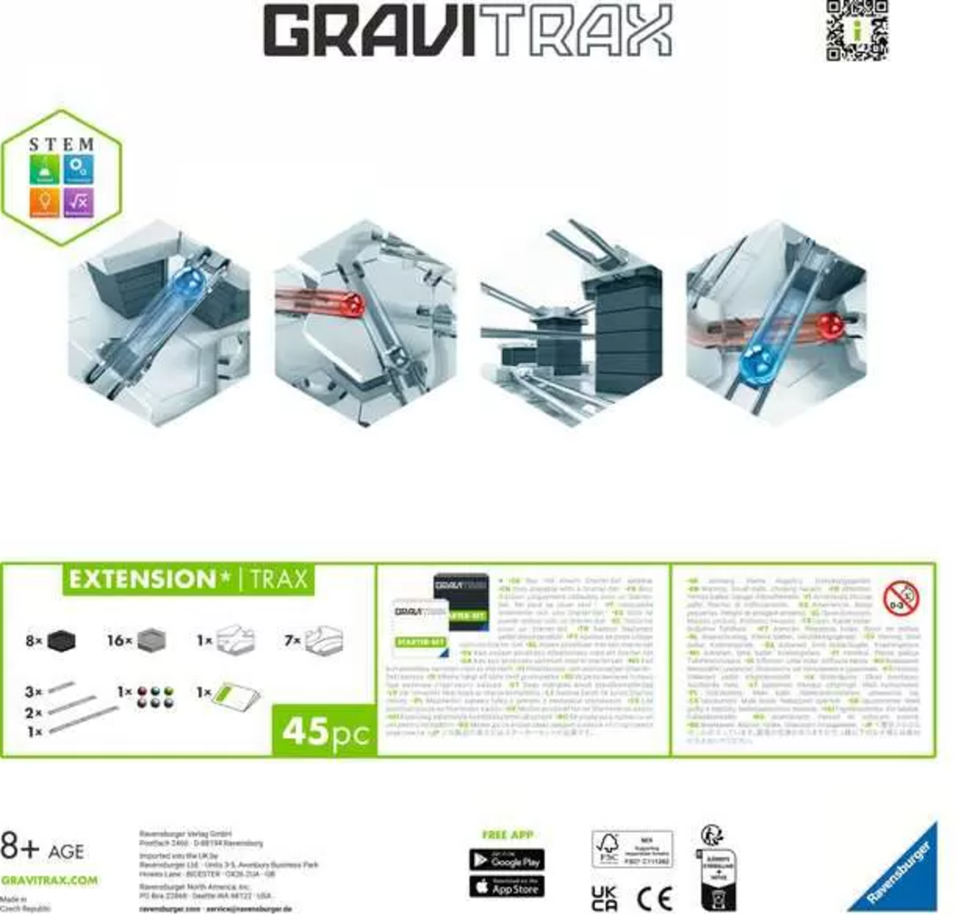 Make your railway even bigger and better with the GraviTrax BASE Extension Trax. This extension is the ideal solution for all young engineers who feel that their marble run has even more potential. With a variety of additional basic components, the GraviTrax universe can be expanded in no time at all.